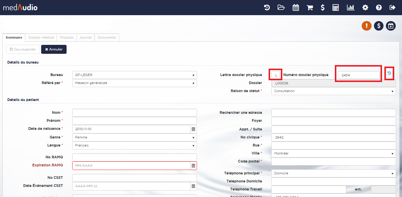 À noter que lors de la modification d'un dossier patient, le champ "numéro de dossier physique" affichera le prochain numéro disponible dans le système. Si vous modifiez le numéro à l'intérieur de ce champ, le numéro de dossier actuel du patient changera pour prendre la nouvelle valeur. Par conséquent, ne modifiez ce champ que si vous souhaitez modifier le numéro de dossier du patient.