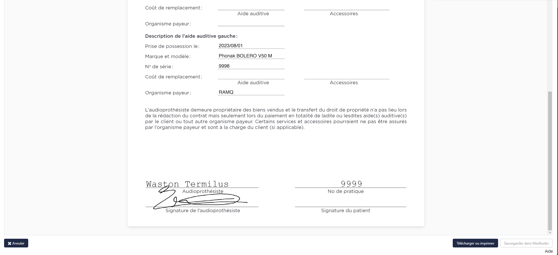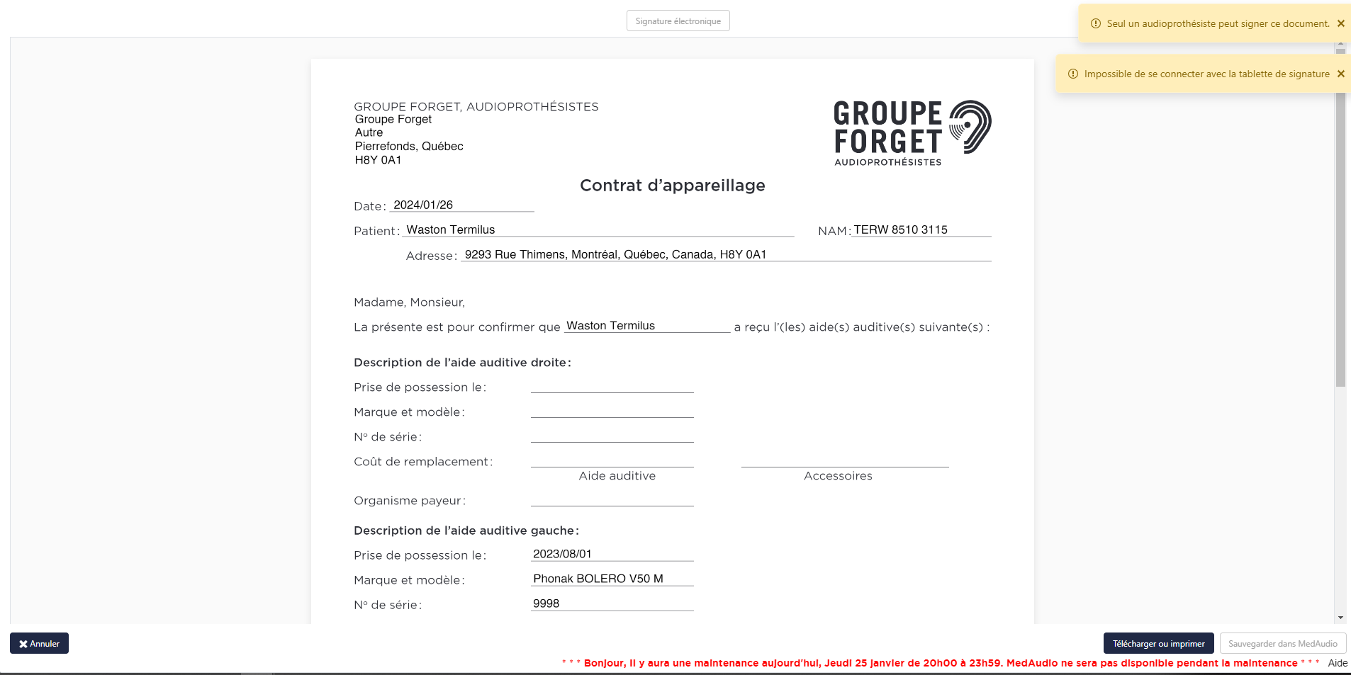 Formulaire 4276: - La génération du contrat d'appareillage a été modifiée afin de permettre la signature du document de manière électronique via Medaudio. Notez qu'il sera toujours possible d'imprimer et signer manuellement le document.