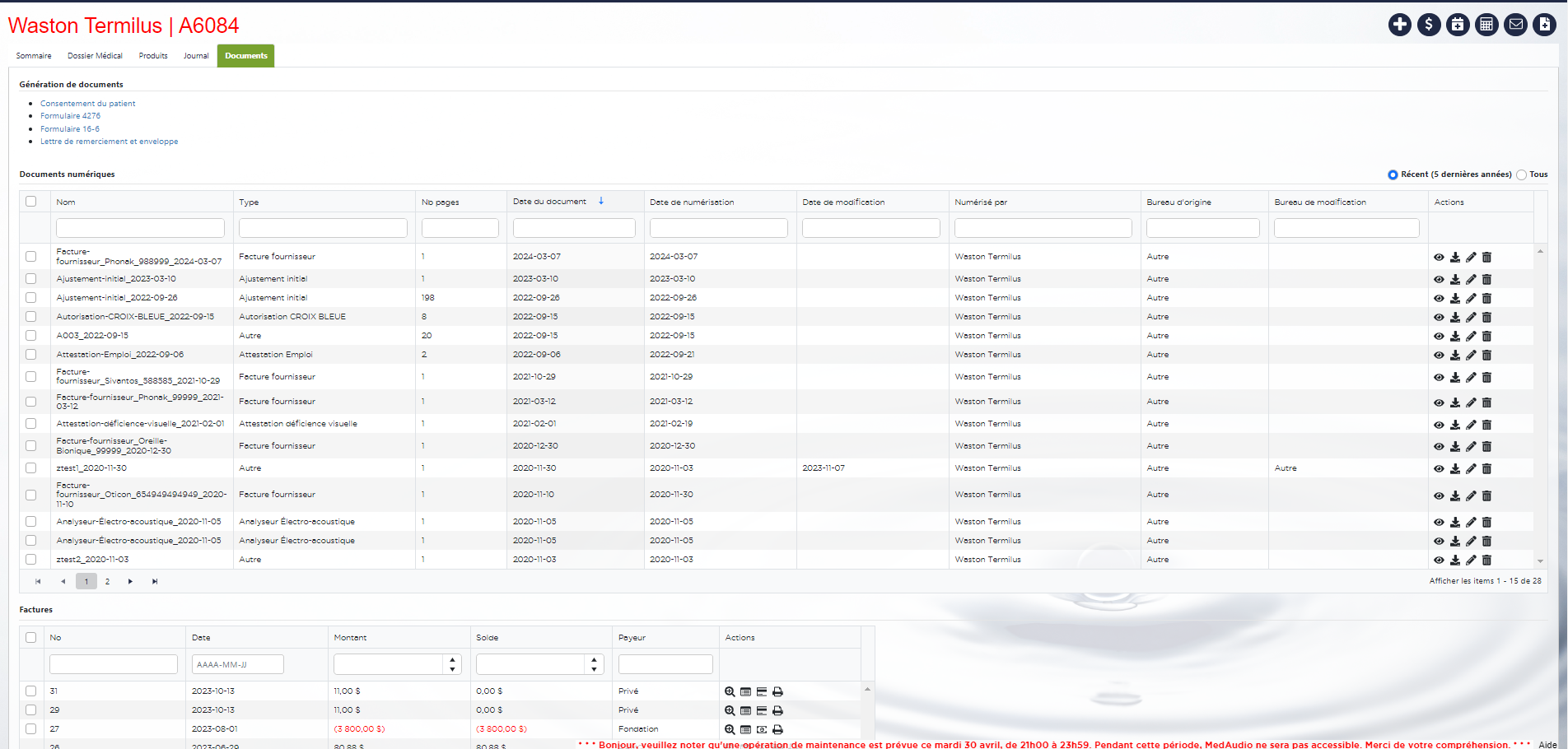 - L'ensemble des factures disponible pour un patient est désormais affiché directement via l'onglet de document du patient