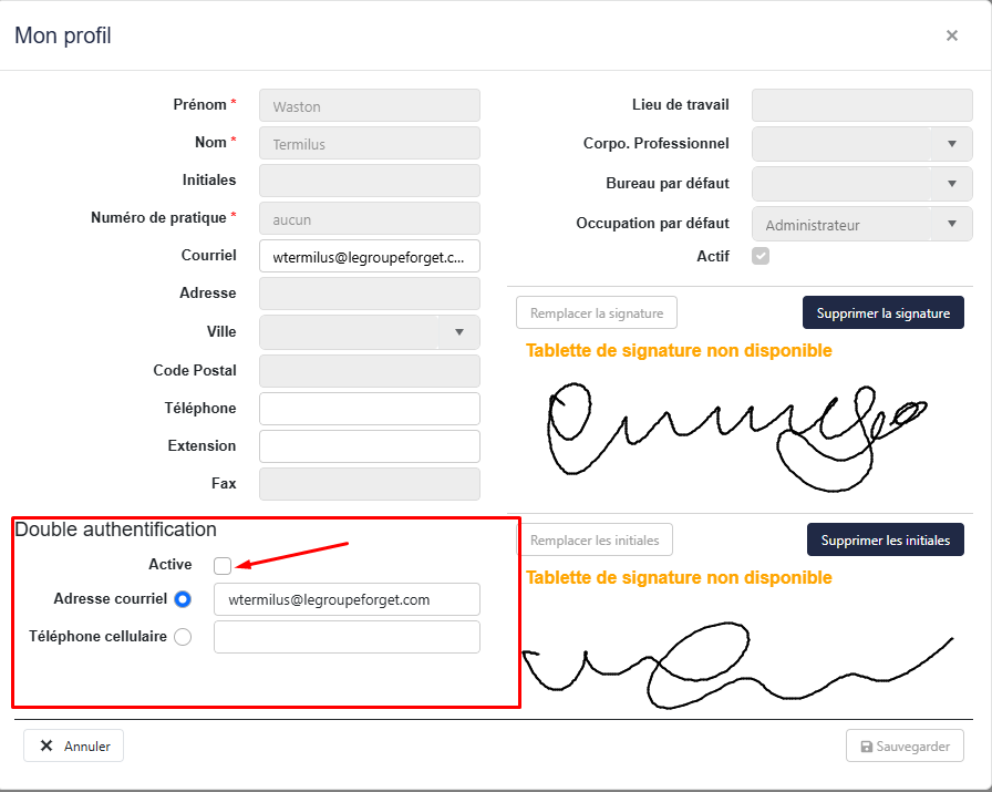- La double authentification peut être activée uniquement si l'utilisateur a une adresse courriel ou un numéro de téléphone valide.